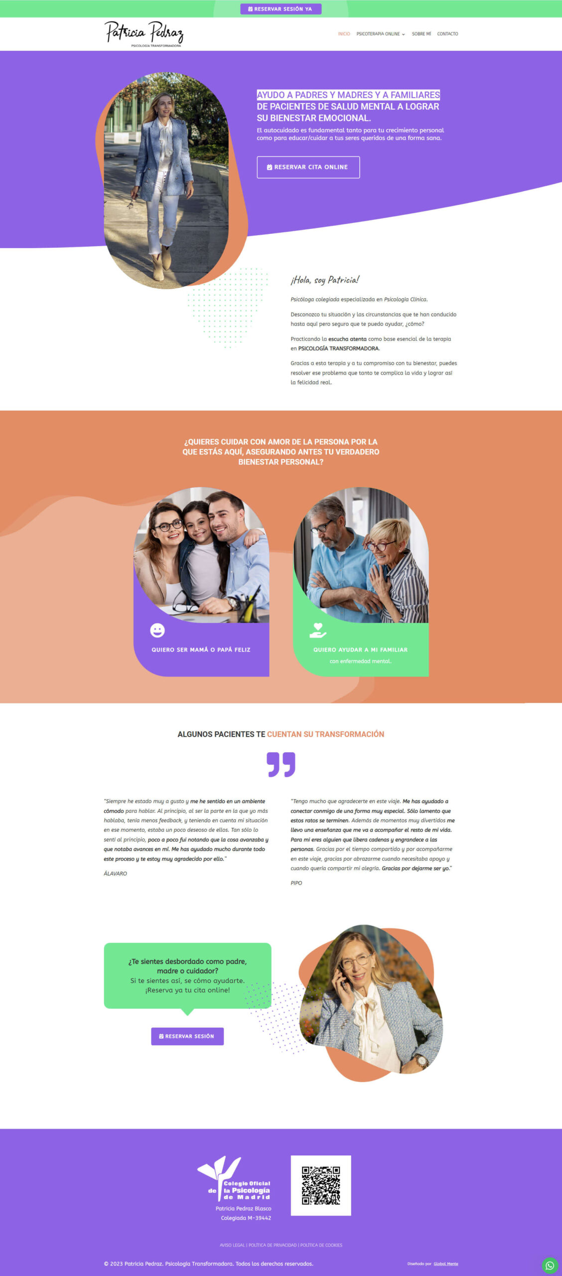 Realizamos el sitio web de la psicóloga Patricia Pedraz, especialista en padres y familiares de pacientes con enfermedad mental. Quería una página alegre y colorida y así resultó. Desde su web puedes concertar una cita para una sesión y abonarla directamente.